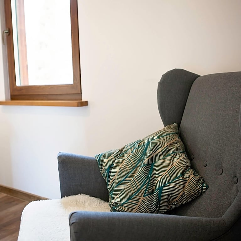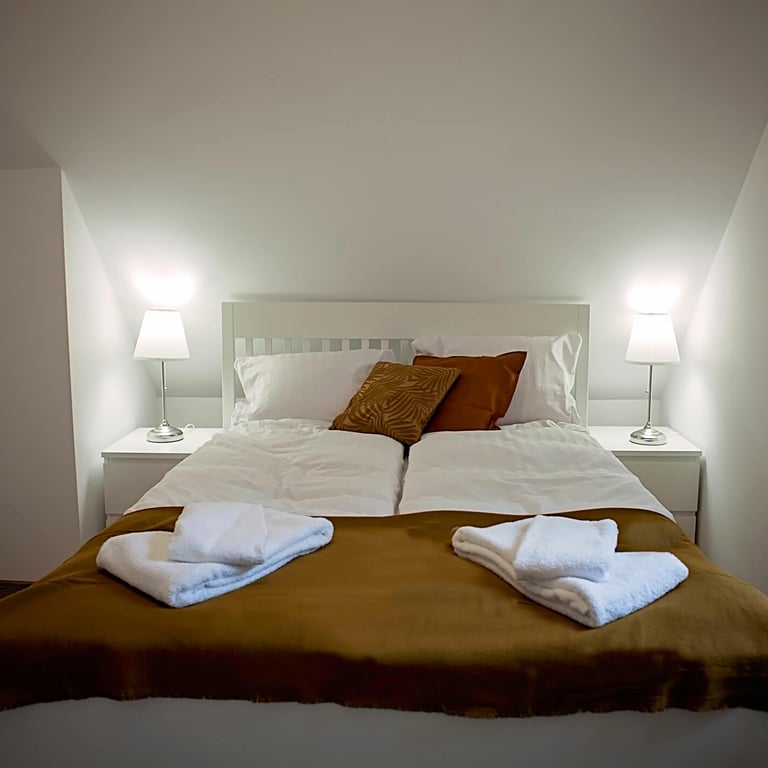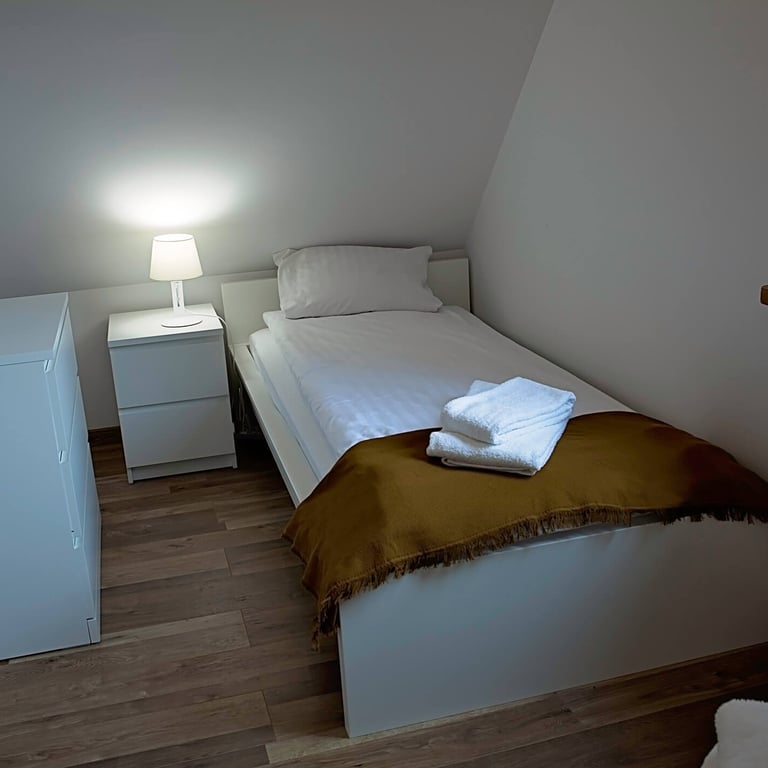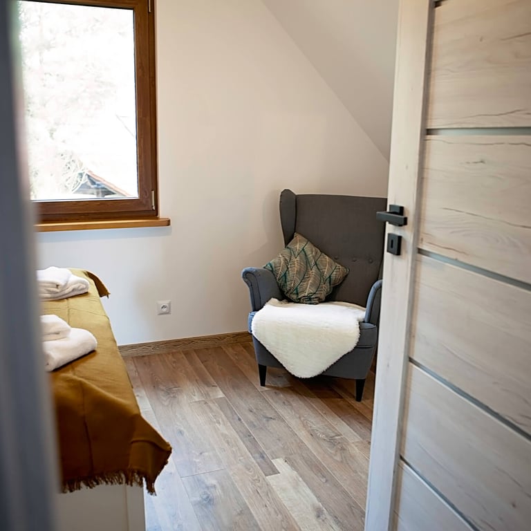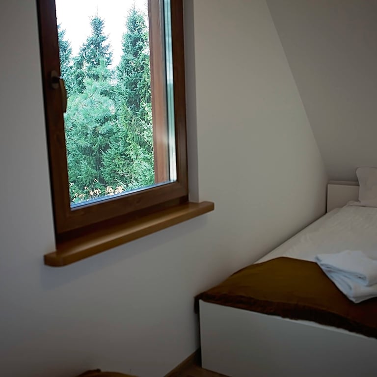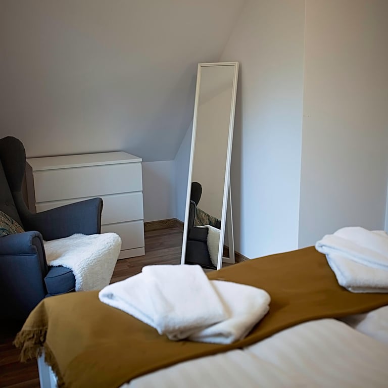 Część sypialniana znajduje się na piętrze domu i do dyspozycji jest duża sypialnia z podwójnym łóżkiem oraz mała sypialnia z łóżkami pojedynczymi.