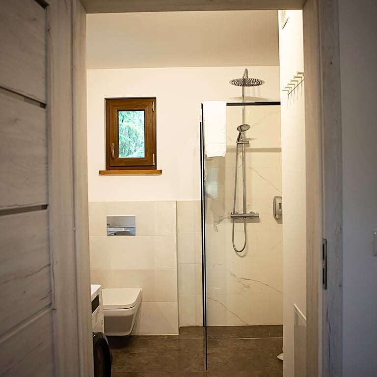 W łazience na parterze mamy przestrzeń kąpielową z prysznicem.