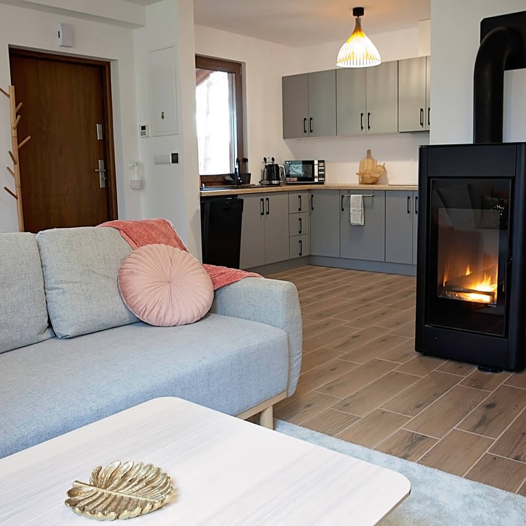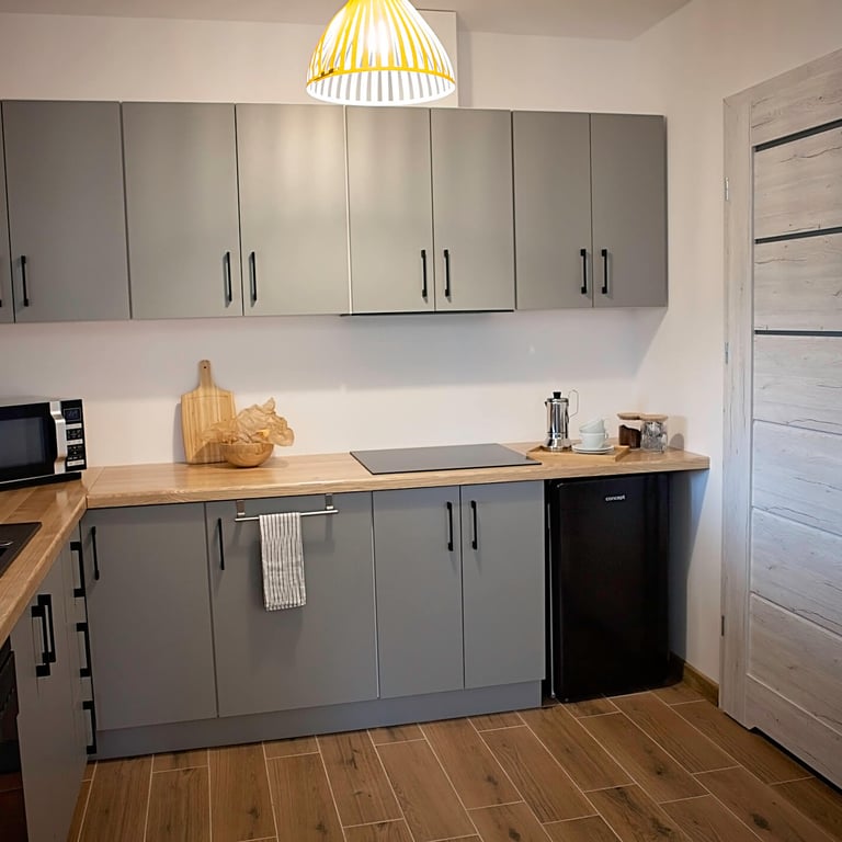 Przestrzeń do gotowania zawiera płytę indukcyjną, zmywarkę, kuchenkę mikrofalową i lodówkę.