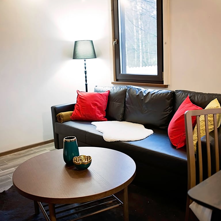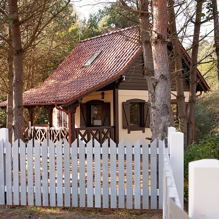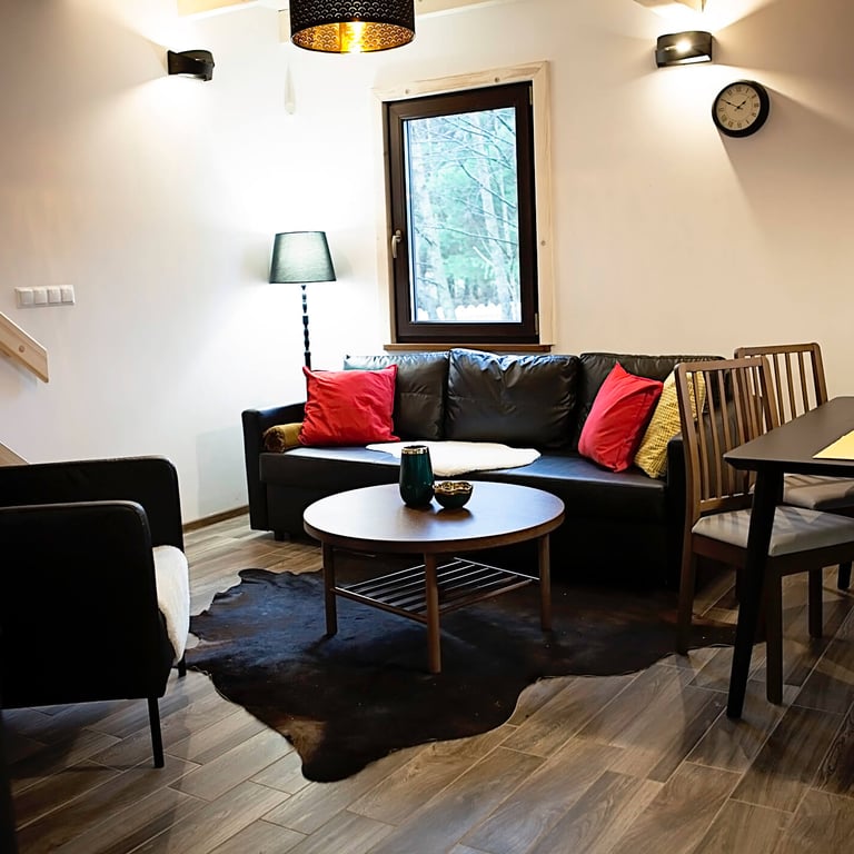 Mały domek z dwoma pokojami oraz dwiema łazienkami.
