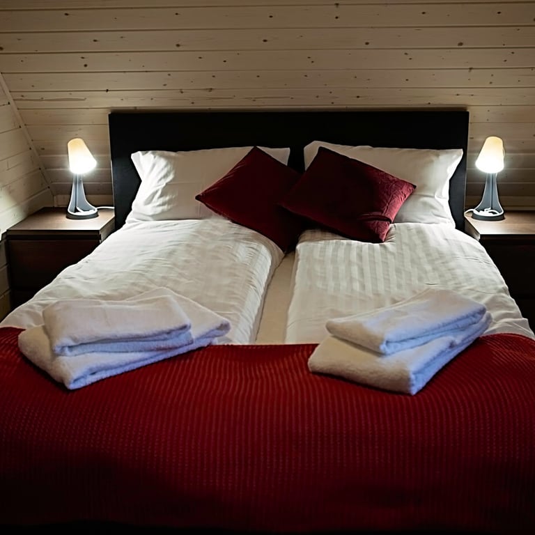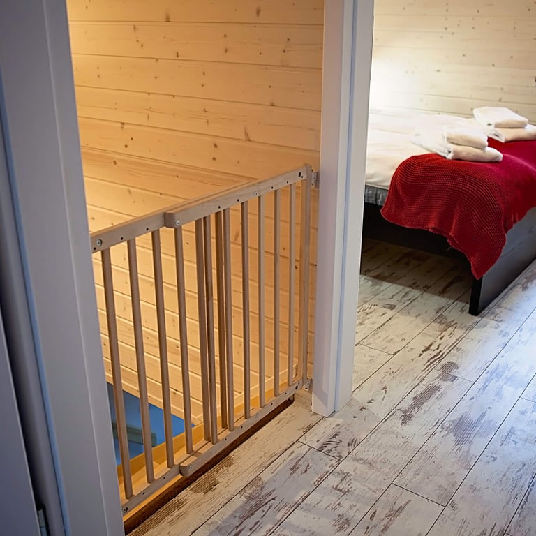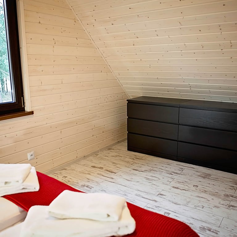 Część sypialniana znajduje się na piętrze domu i do dyspozycji jest duża sypialnia z podwójnym łóżkiem oraz mała sypialnia z łóżkami pojedynczymi.