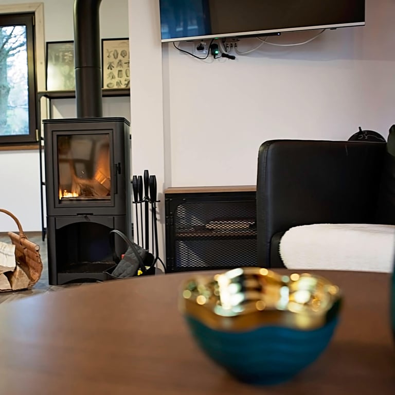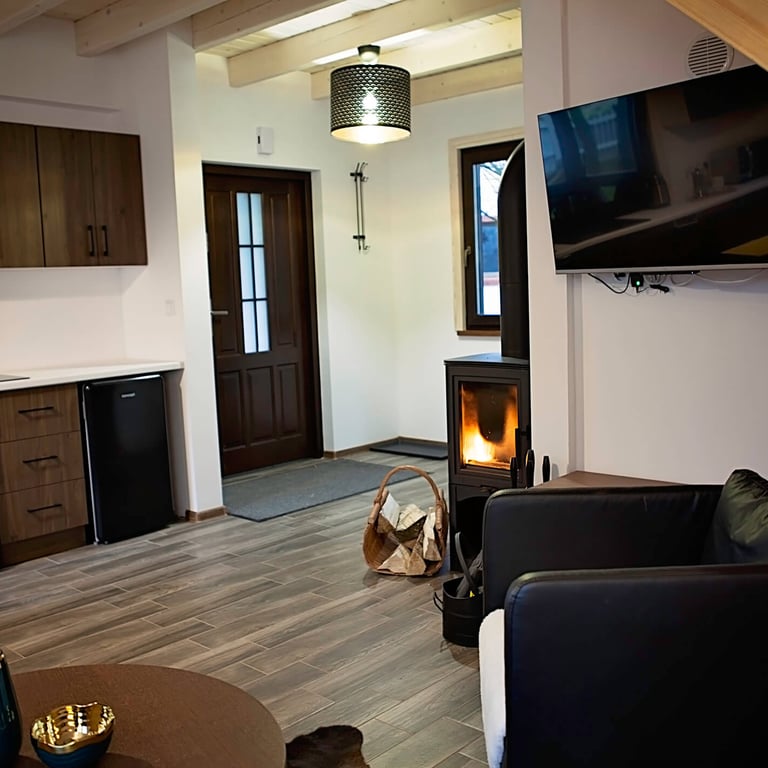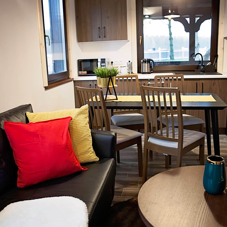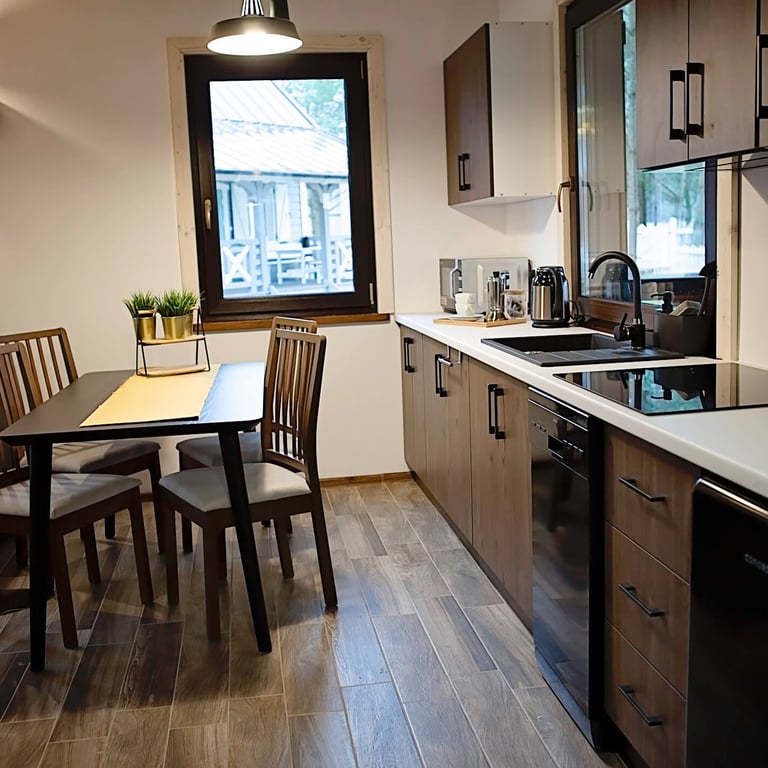 Przestrzeń do gotowania zawiera płytę indukcyjną, zmywarkę, kuchenkę mikrofalową i lodówkę.