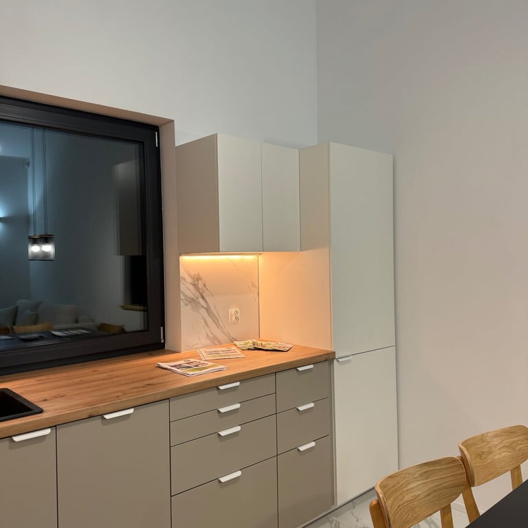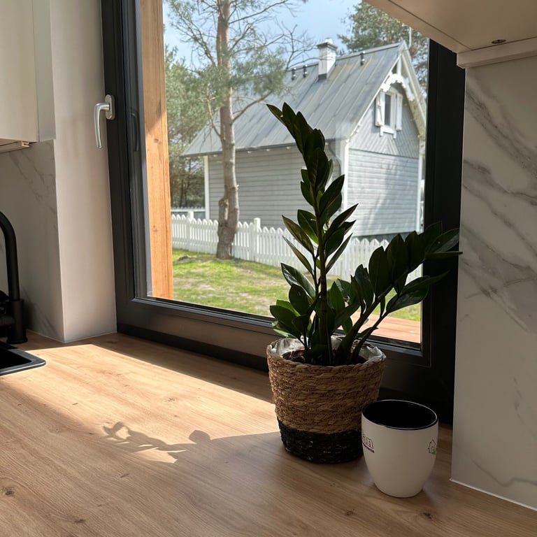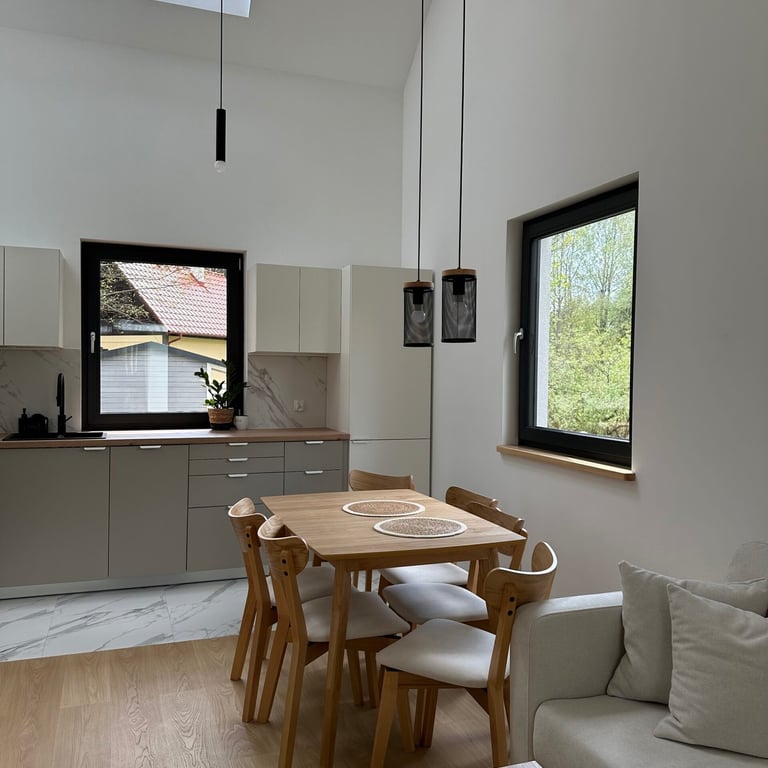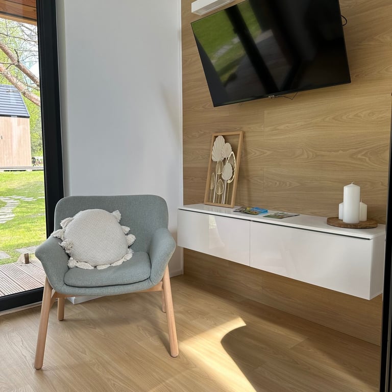 Wnętrze domu „Zakynthos” urzeka swoją przestronnością i funkcjonalnością. Salon połączony z aneksem kuchennym tworzy centralne miejsce spotkań, gdzie goście mogą spędzać czas razem, przygotowywać posiłki czy relaksować się po dniu pełnym wrażeń. Duże okna wpuszczają mnóstwo naturalnego światła, a wyjście na taras umożliwia cieszenie się świeżym powietrzem i pięknymi widokami na otaczającą przyrodę.